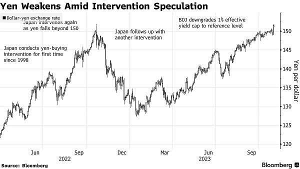因日本央行周二(10月31日)调整收益率曲线控制(YCC)政策力度不及外界预期,日元兑美元暴跌失守151关口、创4月迄今最大单日跌幅。这促使日本最高外汇官员发出警告称,必要时随时准备进场干预。