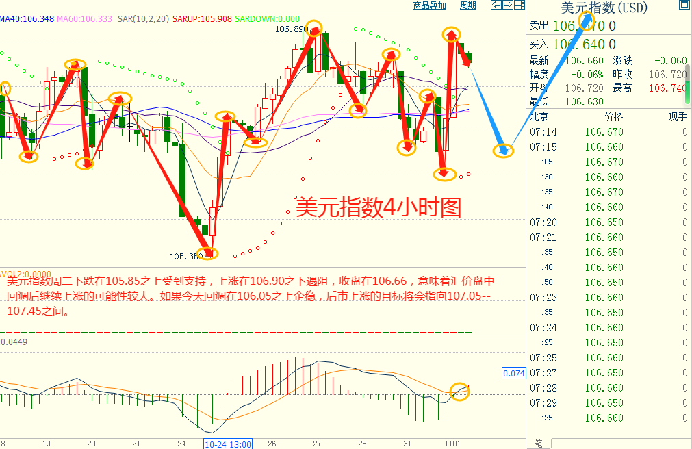 美指周二上涨在106.90之下遇阻,下跌在105.85之上受到支持,意味着美元短线下跌后有可能保持商行的走势。如果美指今天下跌在106.05之上企稳,后市上涨的目标将会指向107.05--107.45之间。今天美指短线阻力在107.00--107.05,短线重要阻力在107.40--107.45。今天美指短线支持在106.45--106.50,短线重要支持在106.05--106.10。