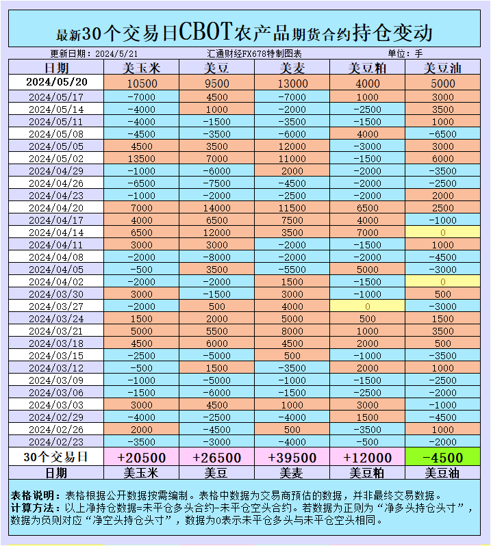 根据汇通财经观察,海外交易商估算的结果显示,本周一(5月20日),大宗商品基金增加CBOT美玉米、美麦、美豆、美豆粕、美豆油投机性净多头头寸。最新30个交易日,大宗商品基金增加美豆粕、美麦、美玉米、美豆投机性净多头头寸,增加美豆油投机性净空头头寸。具体变动数据见图表。