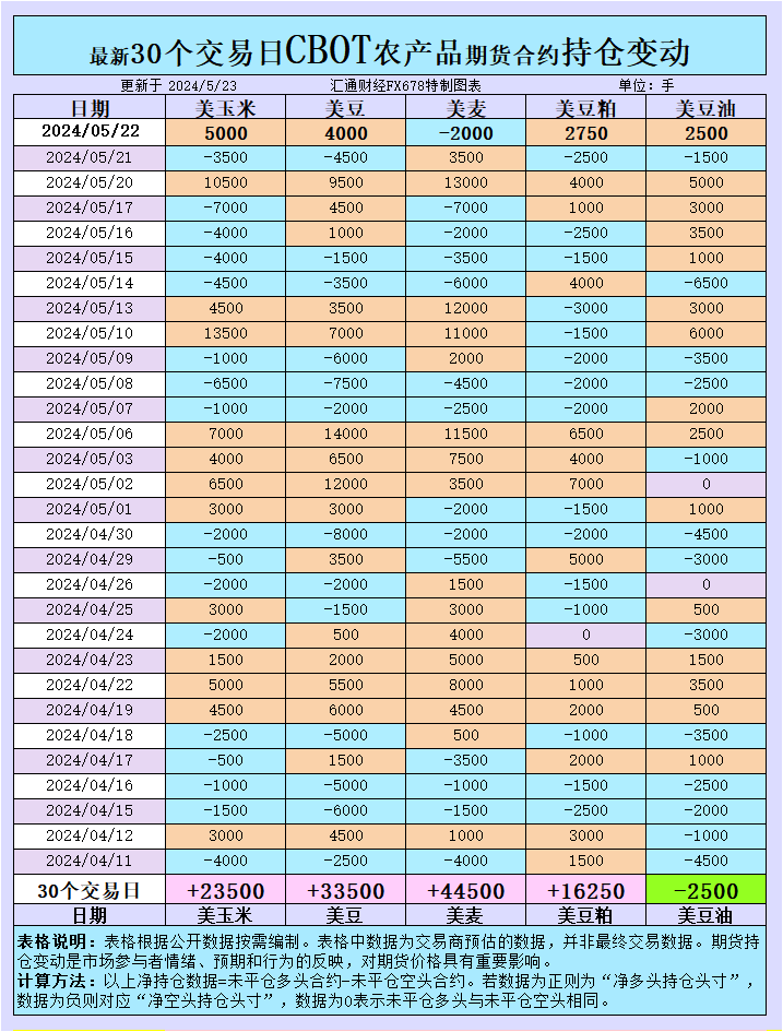 海外交易商估算的结果显示,本周三(5月22日),大宗商品基金增加CBOT美麦投机性净空头头寸。增加美玉米、美豆、美豆粕、美豆油投机性净多头头寸。最新30个交易日,大宗商品基金增加美豆粕、美麦、美玉米、美豆投机性净多头头寸,增加美豆油投机性净空头头寸。具体变动数据见图表。