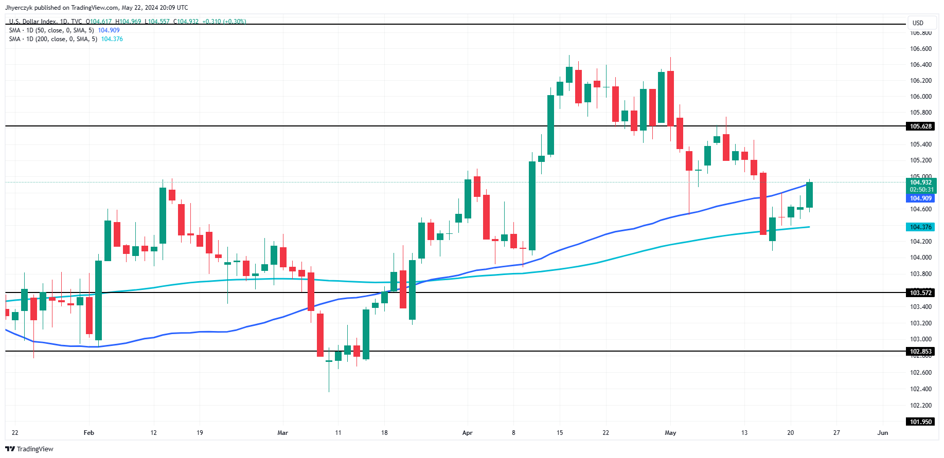 美联储公布5月FOMC份会议纪要后,美元周三(5月22日)飙升,该纪要引发了人们对持续通胀的担忧,并表明近期不太可能降息。市场分析称,成交量上升的背景下,美元指数有望挑战105.74,该位置是5月9日触及的近三周高点。