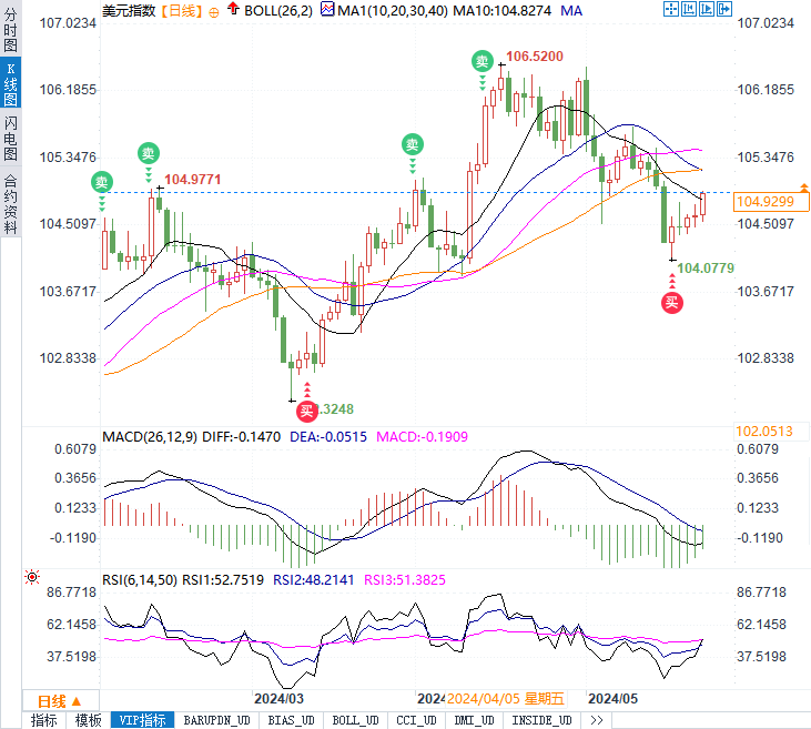 综上所述,尽管市场对美联储短期内降息的预期不高,但即将发布的FOMC会议纪要仍将是市场关注的焦点。美元指数目前正处于关键技术水平附近,其未来走势将受到多种因素的影响,包括美联储的政策决策、全球其他主要央行的动向,以及市场对经济数据的反应。