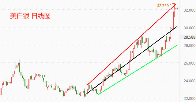 上图为COMEX白银的热线走势图。本月以来,白银的涨势明显强于黄金,操作白银的利润空间更大。技术角度看,红色阻力线和绿色支撑线均向上发散,中期多头趋势延续概率较高。不过,市价已经与红色阻力线交叉,最近三根K线表现出长上影特征,短期遇阻回落概率较高。第一支撑位在黑色回归线附近,第二支撑位在绿色支撑线附近。
