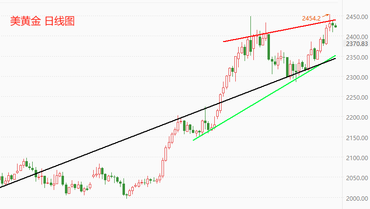 上图为COMEX黄金日线走势图。市价处于黑色回归线上方,与红色阻力线交叉。本周一的K线突破阻力线后迅速回落,市价又来到了阻力线下方。技术角度看,阻力线发挥作用的可能性较高,金价后市存在回落风险。绿色支撑线与黑色回归线相互交叉,交叉点在2330美元附近。当前市价2422美元,如果未来出现回调,2330将有可能成为有效支撑,目前的回调空间为3.8%。