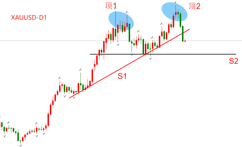 上图为XAUUSD日线级别走势图。第一个顶部形成于今年4月份,从最高点到最低点的最大回调幅度为6.3%;第二个顶部形成于本周,截至昨日的最大回调幅度为5%,仍存继续回调空间。图中有两个支撑线,支撑线S1已经与昨日的K线交叉,趋势已经发生初步转折。支撑线S2起到确认作用,如果今日或者下周的K线跌破S2,意味着回调波段正式转变为下跌趋势。