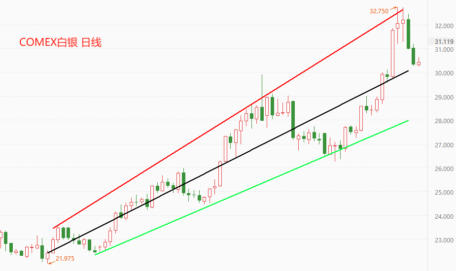 上图为COMEX白银日线走势图。白银和黄金虽然同属于贵金属,也都具有避险属性,但在走势结构方面存在较大差距。黄金的日线已经形成双顶结构,而白银的日线仍处于上升通道内部。本周前两个交易日,COMEX白银创阶段性新高后在高位横盘,周三和周四两个交易日连续大跌,明显是受到了黄金跌势的影响。目前市价来到了黑色中轴线附近,需要观察是否会形成有效突破。一旦有效突破形成,后市将向绿色支撑线移动,回调幅度也将逐渐拉大。