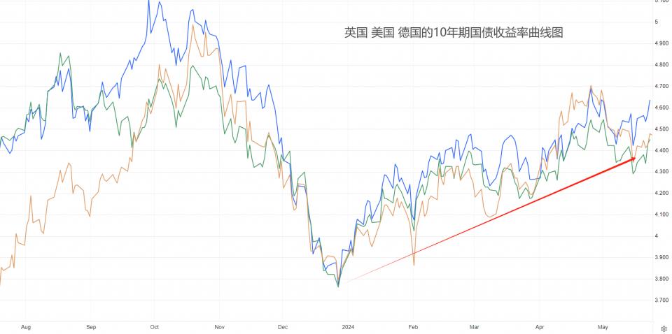 上图为美国、英国、德国的10年期国债收益率走势图。当全球经济面临衰退风险时,这三个国家的债券收益率会倾向于下行,中央银行的降息预期也会变得非常浓厚。当全球经济有复苏或者过热可能时,这三个国家的债券收益率倾向于上行,中央银行的加息预期也变得非常浓厚。2023年12月份以来,三个国家的国债收益率持续走高,5月初虽然出现短暂的下降,但中旬之后再回到上升状态。这种走势代表全球经济运行过热的概率要高于衰退的概率,限制性高利率维持的时间可能比此前市场预期的要久。这将对美元指数形成提振。据此判断,XAUUSD在形成双顶结构后,未来启动中期下跌走势的概率比较高。一旦COMEX白银跌破上升通道,预计将与黄金一同展开跌势。