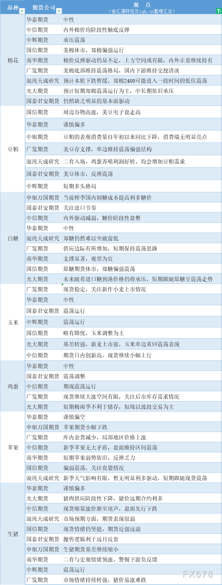 期货公司观点汇总一张图:5月28日农产品(棉花、豆粕、白糖、玉米、鸡蛋、生猪等)