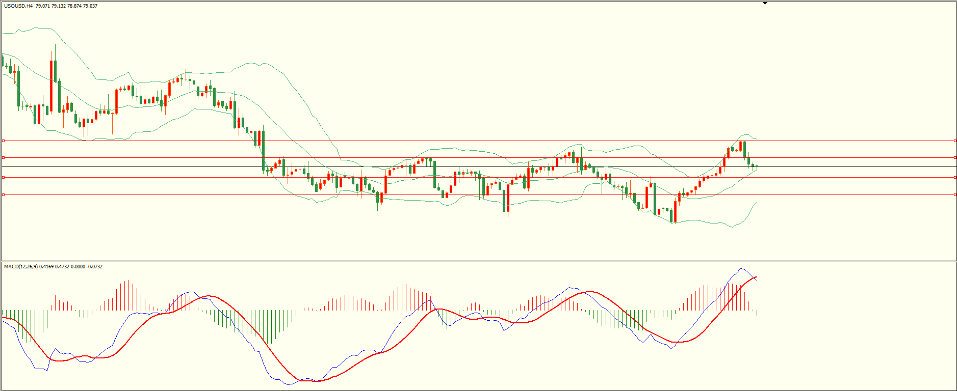 原油昨日先扬后抑,纽约盘时段回落至前支撑跌势缓和,日线报收上下影线中阴线,总体来看,上方阻力并未收复,同时下方面临多重支撑,短线的多空争夺有望继续,从4H来看,布林中轨偏上,MACD零轴上方运行,日内上方首要阻力79.50,第二阻力80。40,下方支撑78.40-50,77.55,保持在第一阻力下方短线有望测试第一支撑。