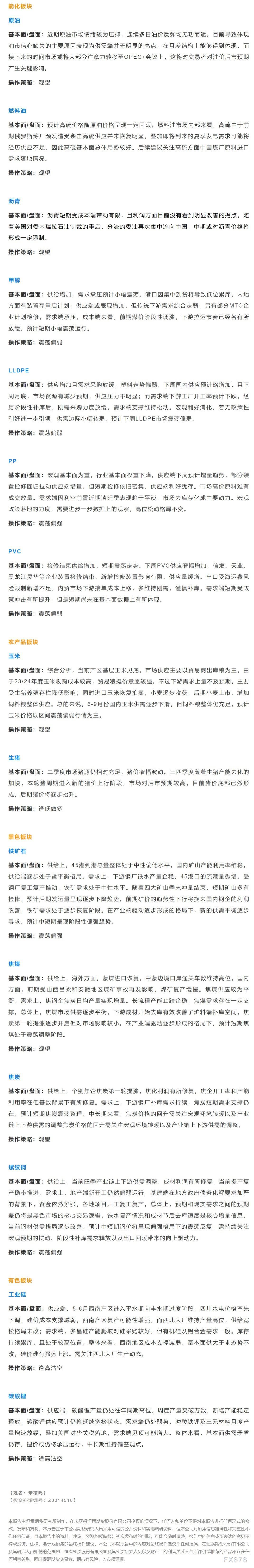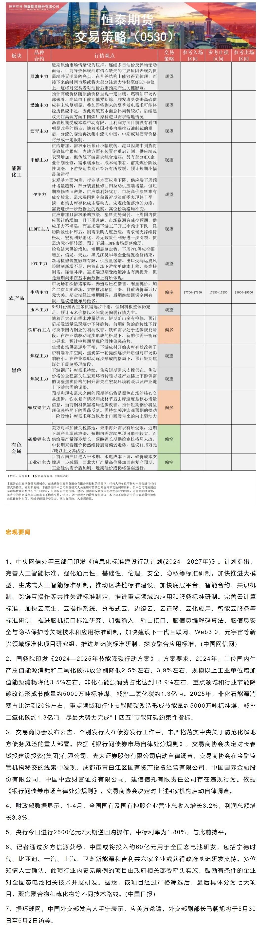 以下是恒泰期货今日早间交易策略,覆盖品种有:宏观分析、原油燃料油等能源化工、玉米生猪等农产品、黑色系如铁矿石焦煤焦炭螺纹钢、有色系如工业硅碳酸锂等。
