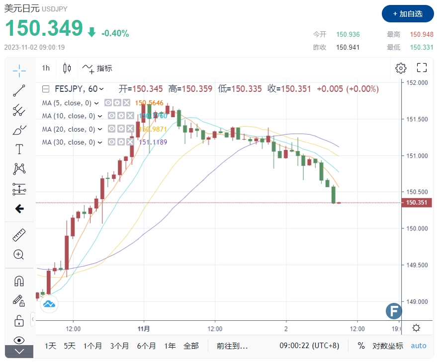 周四(11月2日)亚市早盘,美元/日元跌至150.15,一路从隔夜151.70高点回落。日本干预威胁,以及美联储转向鸽派路径,为日元创造喘息的空间,交易员无法持续站稳151新上限。但技术分析指出,美元/日元仍处于看涨阶段,周五发布的美国非农就业报告(NFP)将成为关键的交锋点。