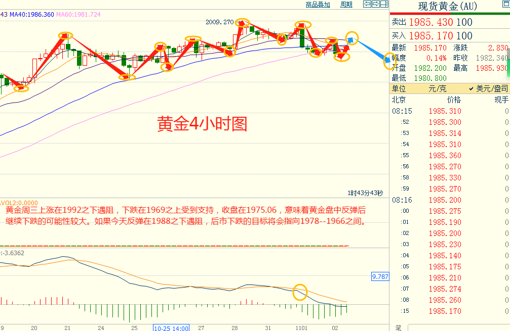 黄金周三下跌在1969.00之上受到支持,上涨在1992.00之下遇阻,意味着黄金短线上涨后有可能保持下跌的走势。如果黄金今天上涨在1988.00之下遇阻,后市下跌的目标将会指向1978.00--1965.00之间。今天黄金短线阻力在1987.00--1988.00,短线重要阻力2000.00--2001.00。今天黄金短线支持在1978.00--1979.00,短线重要支持在1965.00--1966.00。