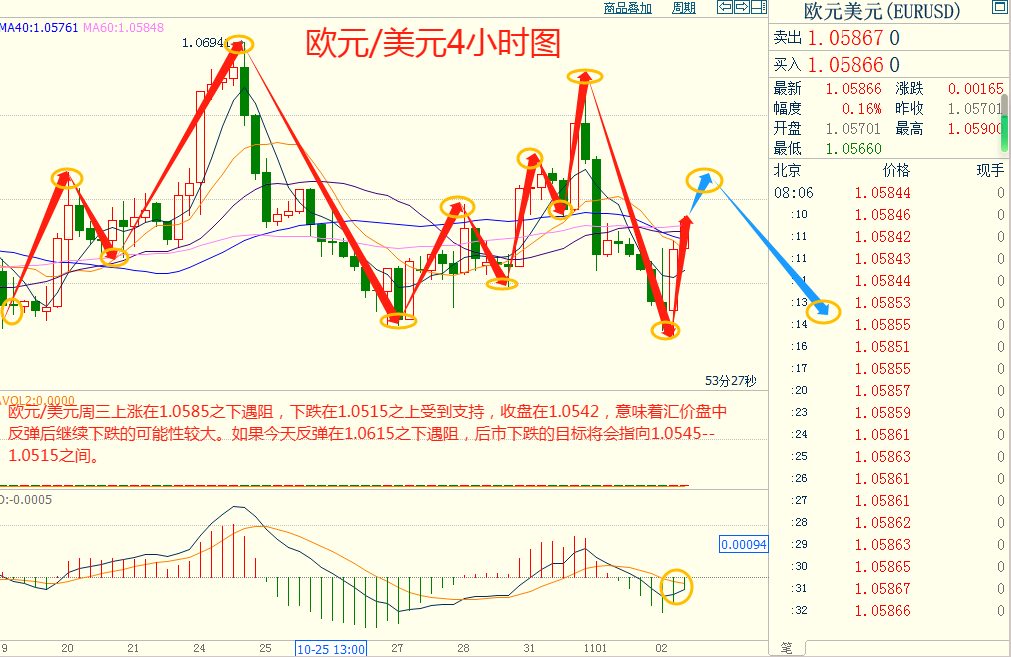 欧美周三下跌在1.0515之上受到支持,上涨在1.0585之下遇阻,意味着欧美短线上涨后有可能保持下跌的走势。如果欧美今天上涨在1.0615之下遇阻,后市下跌的目标将会指向1.0510--1.0480之间。今天欧美短线阻力在1.0610--1.0615,短线重要阻力在1.0650--1.0655。今天欧美短线支持在1.0545--1.0550,短线重要支持在1.0510--1.0515。