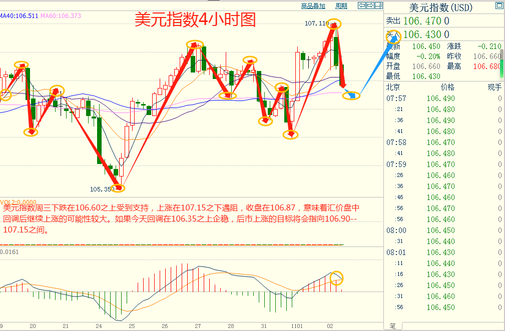 美指周三上涨在107.15之下遇阻,下跌在106.60之上受到支持,意味着美元短线下跌后有可能保持上涨的走势。如果美指今天下跌在106.35之上企稳,后市上涨的目标将会指向107.15--107.35之间。今天美指短线阻力在106.85--106.90,短线重要阻力在107.10--107.15。今天美指短线支持在106.35--106.40,短线重要支持在106.05--106.10。