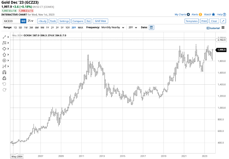 金价在2023年5月从1,615.10美元上涨28.3%至2,072美元。2023年10月月度看涨模式之后类似的百分比变动将使附近的黄金期货价格突破每盎司2,300美元的水平。