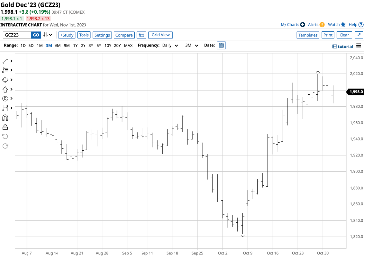 上面图表显示2023年10月的低点较低,连续合约价格跌至1,809.40美元,低于2023年9月低点1,846美元。与此同时,2023年9月的高点为1,950美元,2023年10月31日的收盘价高于1,985美元,导致了另一个看涨的关键反转模式,这次是在月度图表上。 上一次月度看涨关键逆转发生在2022年11月。