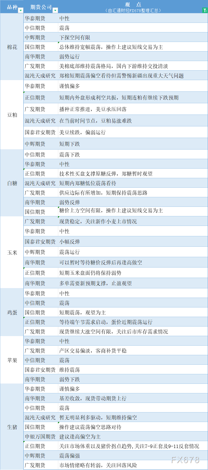 期货公司观点汇总一张图:6月4日农产品(棉花、豆粕、白糖、玉米、鸡蛋、生猪等)