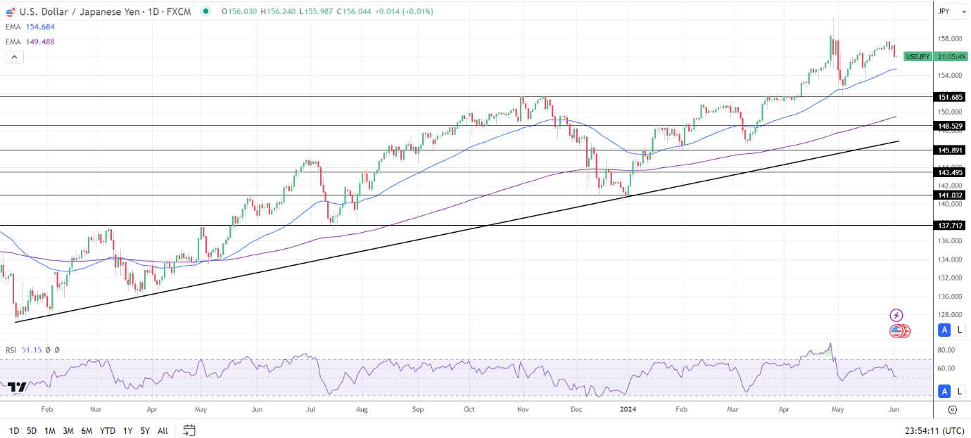 14天RSI为51.15,表明美元/日元将升至4月29日的高点160.209,然后进入超买区域。
