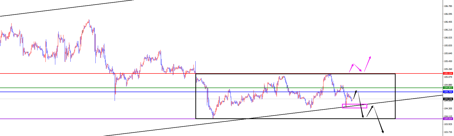 美元指数方面,周一美元指数价格总体呈现下跌的状态。当日价格最高上涨至104.742位置,最低于104.035位置,收盘于104.039位置。回顾周一美指价格表现,早间开盘后价格短线震荡运行,随后向上测试我们昨日布局空的区域后进行弱势下跌,并且价格进行去跌破下方关键支撑区域,目前看美指如期下破,后续持续关注逢高空,短线位置上暂时关注104.40-50区间,此区域是目前四小时及日线阻力区域同时也是价格跌破上涨通道下边缘回踩的区域,后续重点关注此区域承压,下方则关注103.80-103.20区域支撑。