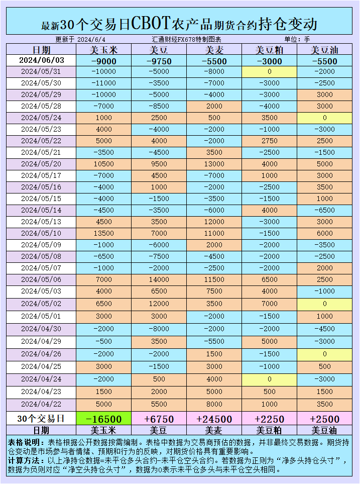 增加CBOT玉米投机性净空头;增加CBOT大豆投机性净空头;增加CBOT小麦投机性净空头;增加CBOT豆粕投机性净空头;增加CBOT豆油投机性净空头。