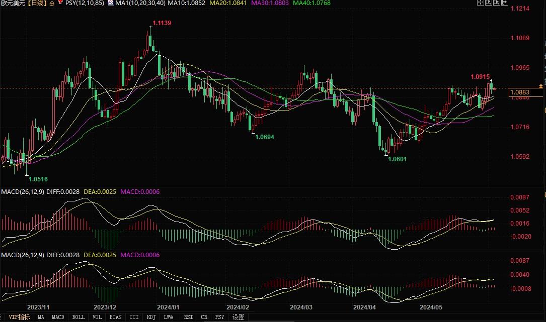 北京时间6月5日9:16,欧元兑美元报1.0882/83