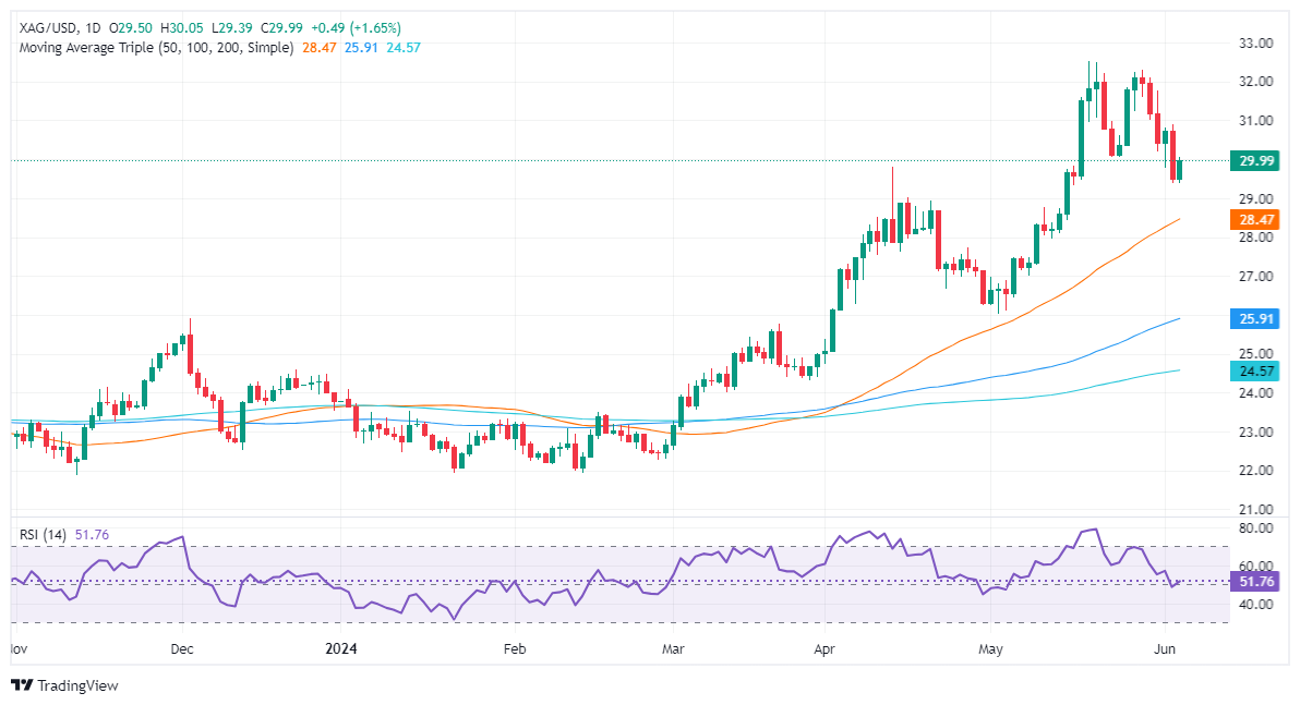 假如买家未能收复30.00美元/盎司,以及至5月24日低点30.05美元/盎司,这将为银价进一步下跌铺平道路。