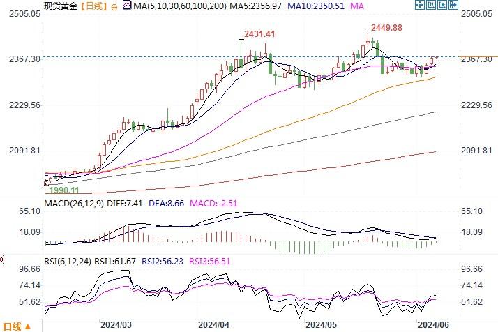 周四(6月5日),金价盘中最高升至两周高点2378.36美元/盎司,收盘阶段现货金报每盎司2,375.60美元,全日上涨了0.8%。