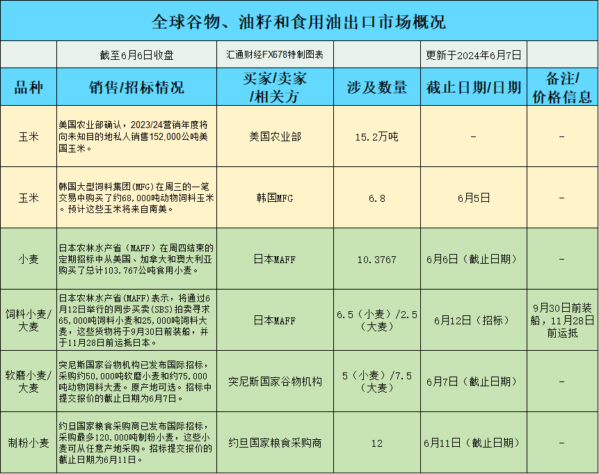 全球谷物、油籽和食用油出口市场招标、采购概况(24年6月7日):