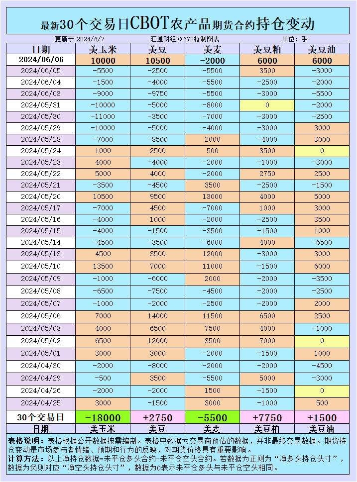 增加CBOT玉米投机性净多头;增加CBOT大豆投机性净多头;增加CBOT小麦投机性净空头;增加CBOT豆粕投机性净多头;增加CBOT豆油投机性净多头。