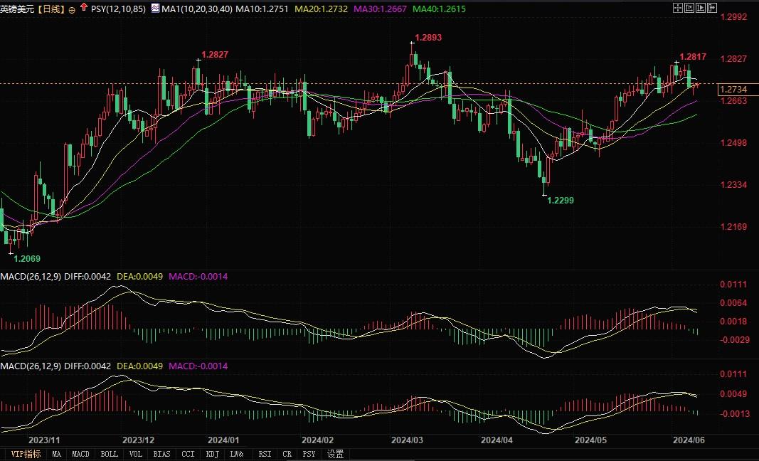美国5月非农强于预期,降低了美联储9月份降息的可能性,并引发了人们对美联储在2025年之前不会降息的猜测。受此影响,英镑兑美元出现下跌,目前交投于1.2735附近。
