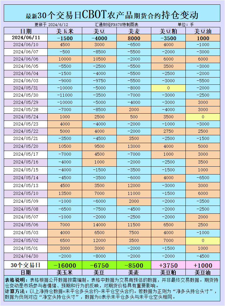 增加CBOT玉米投机性净空头;增加CBOT大豆投机性净空头;增加CBOT小麦投机性净多头;增加CBOT豆粕投机性净空头;增加CBOT豆油投机性净多头。
