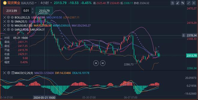 黄金技术面分析:昨日受数据CPI报告意外疲软影响现货黄金得到提振,冲击2340美元一线,后因美联储最新利率预测放出鹰派信号而有所回落,今日开盘短线回落最低下探2315一线后回踩2324一线震荡收盘黄金昨日收一根穿头破脚小阳线 今天早上来了一波大回调昨日已经出现日线的高点上移 但是今天并没有走延续 反而出现了低点下移,4小时布林线有收口状态,MACD红色微量减弱,李廉洋建议短期关注上方主力2327-2348,下方支撑关注2290-2279,今日思路建议以回调做多为主,若下发触及2309-2206区域进多,止损2300,目标2325-2335.多位进场在临盘给出提示;