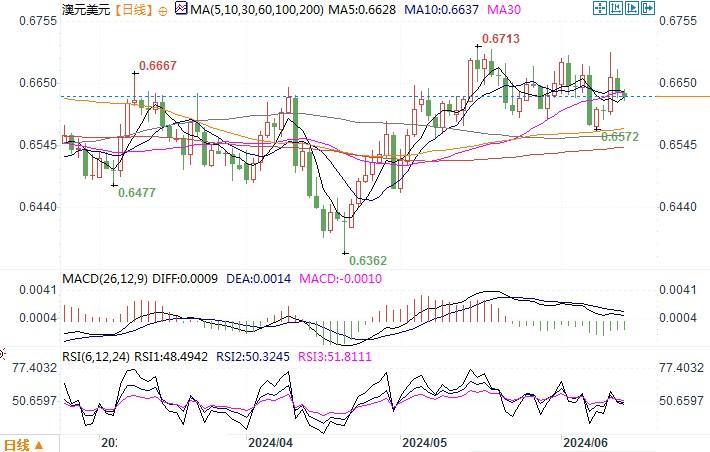 周四(6月13日),尽管美国公布的5月生产价格指数PPI低落,然受周三美联储利率会议上偏向鹰派的基调影响,美元周四上涨,澳元/美元跌0.42%,收盘于0.6635。周四澳大利亚公布5月季调后失业率4%,前值4.1%;新增就业人口3.97万人,预期增3万人,前值3.85万人。良好的就业数据一度提升澳联储延后降息甚至排除再度加息的预期,而澳元也曾为之受到一定的提振。然而,周三美联储利率会议上决策层普遍持鹰派的态度,使得美元降息时点的预期大大延后,其影响力掩盖了表现颇佳的澳洲就业数据光芒,澳元/美元被迫受压下行。预料在无重大消息影响下,澳元/美元将保持宽幅区间震荡的走势,波动区间主要集中在0.6570-0.6720之间。