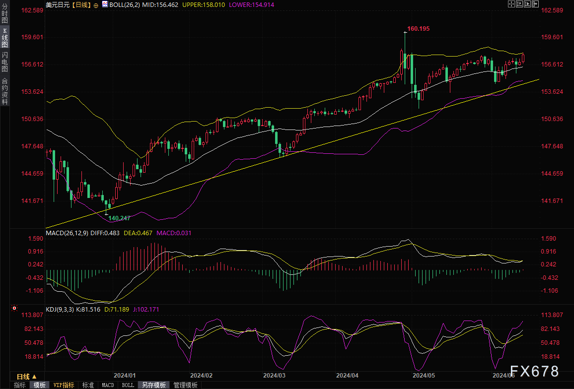 美元/日元突破157.50,将支持其向159方向发展。如果升至159,则可能推动多头冲向4月29日高点160.209。
