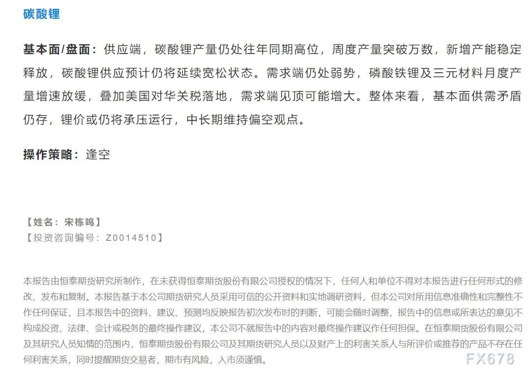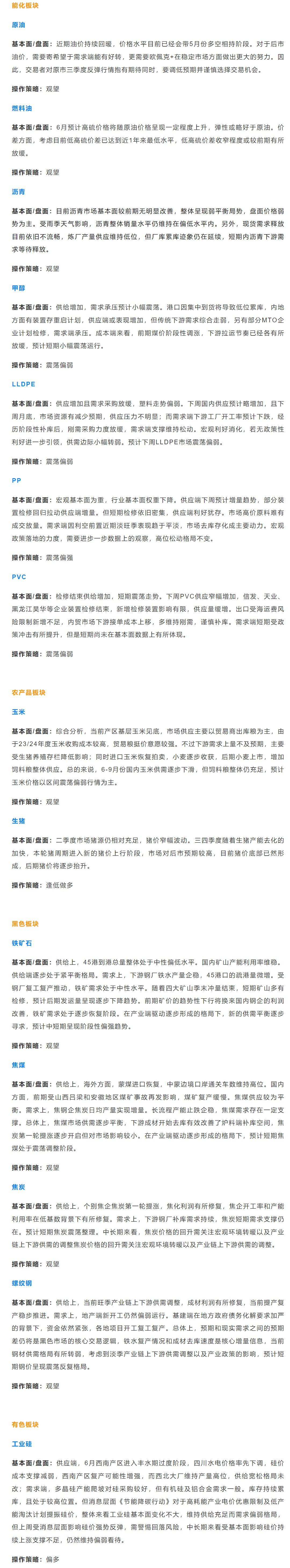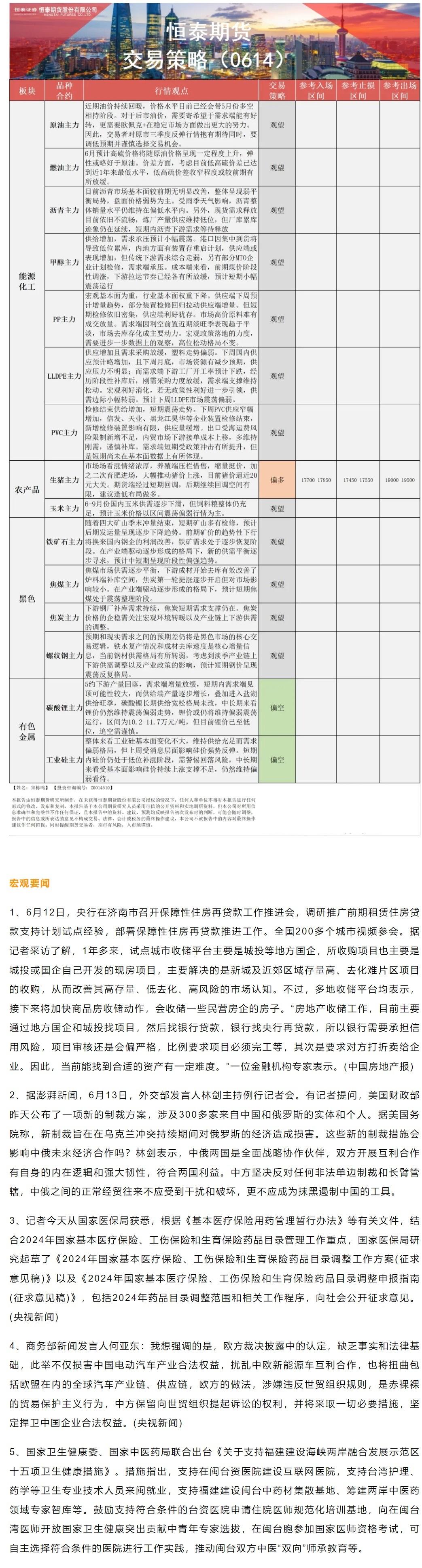 以下是恒泰期货今日早间交易策略,覆盖品种有:宏观分析、原油燃料油等能源化工、玉米生猪等农产品、黑色系如铁矿石焦煤焦炭螺纹钢、有色系如工业硅碳酸锂等。