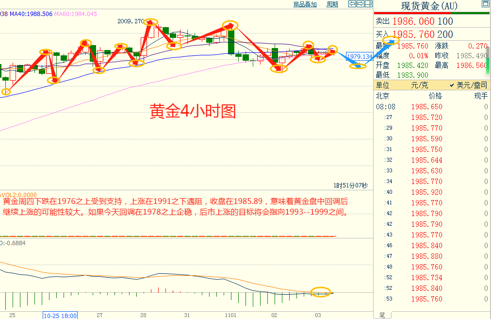 黄金周四下跌在1976.00之上受到支持,上涨在1991.00之下遇阻,意味着黄金短线下跌后有可能保持上涨的走势。如果黄金今天下跌在1978.00之上企稳,后市上涨的目标将会指向1993.00--1999.00之间。今天黄金短线阻力在1992.00--1993.00,短线重要阻力1998.00--1999.00。今天黄金短线支持在1978.00--1979.00,短线重要支持在1970.00--1971.00。