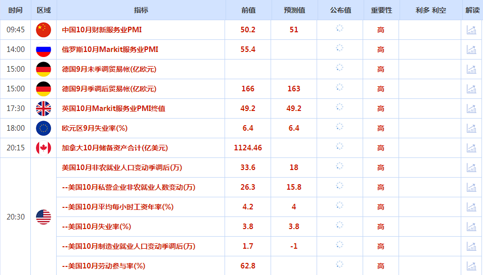 在就业数据公布之前,一份报告显示美国劳动生产率出现3年来最大涨幅,有助于缓解近期工资增长带来的通胀影响。申请失业救济人数连续第6周上升,表明失业者开始更难以找到新工作。经济学家预测,继9月份非农就业人数增加336,000人之后,10月份非农就业人数将增加180,000人。
