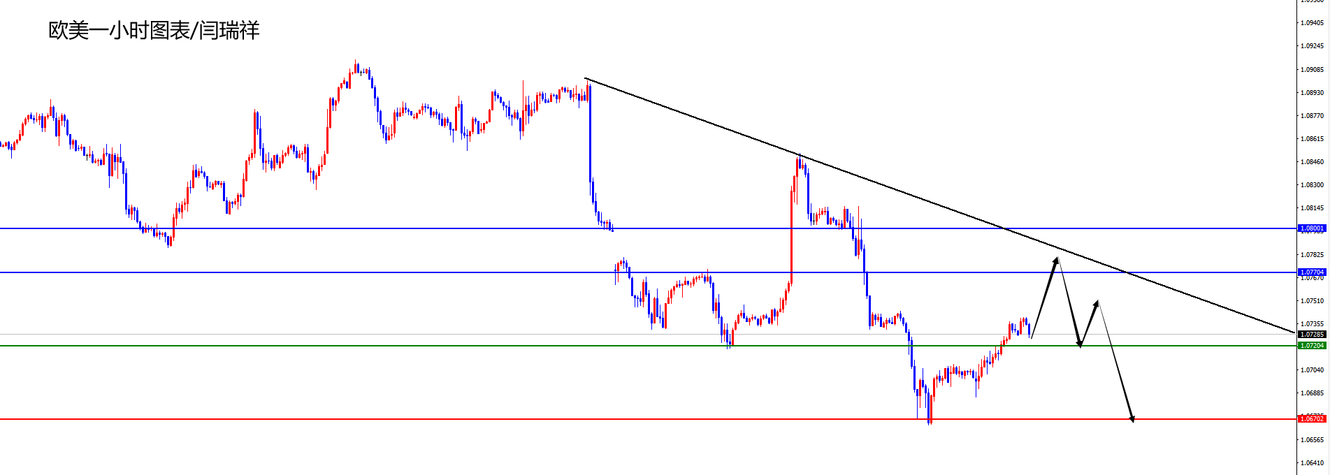 欧美方面,周一欧美价格总体呈现上涨的状态。当日价格最低下跌至1.0685位置,最高上涨至1.0737位置,收盘于1.0733位置。回顾周一欧美市场表现,早间开盘后价格短线震荡后如期向上修正,价格整体上正如笔者所言,目前看欧美周线阻力于1.0770区域,日线阻力于1.0800区域,由于价格整体依旧属于空头走势,所以暂时等待价格向上修正到位后布局,今日暂时等待价格到达1.0770-80区间后看承压,下方短线关注1.0720-1.0670区域。