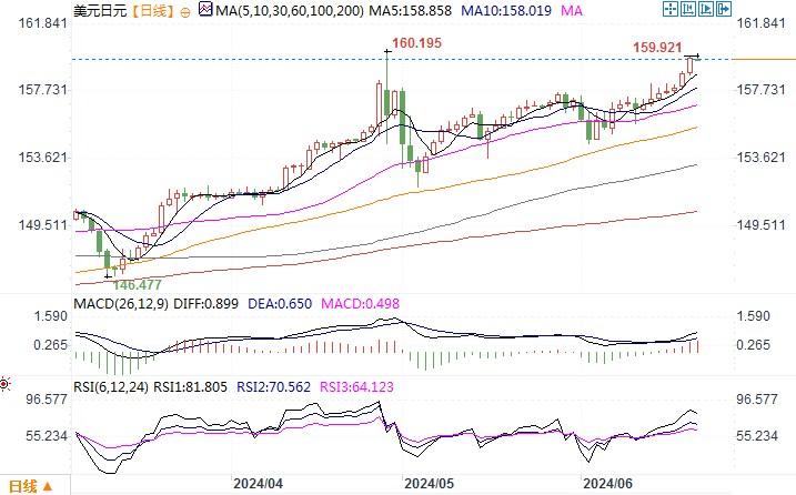 周五(6月21日), 美元/日元当日上涨0.4%收盘于报159.59,盘中曾创八周以来的新高159.84。周五来自美国6月企业活动创下26个月新高,美国经济强劲,且美联储对降息采取的耐心态度与更加鸽派的其他主要央行形成鲜明对比,令美元在保持息差优势的推动下继续维持着强势。此外,美国财政部周四将日本列入可能被认定为汇率操纵国的观察名单,这是对进一步干预的外交警告,从而大大降低了日本采取干预行动的风险。解除干预顾虑的套利交易有点脱缰的味道,日元的贬值势头又有重新加速的倾向。从日线图上观察,美元/日元汇价上涨至布林带通道上轨线,布林带喇叭口继续扩大,MACD、RSI等技术指标均呈明显上摆倾向,显示美元/日元多头处于强势上涨之中。当前汇价离年内高点160.03近在咫尺,若穿越上述高点,美元/日元有望进一步创下年内新高纪录。下方的初步支撑落在156.65-157.06区域。