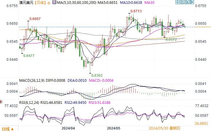 周五(6月21日),因美元全面走强,澳元/美元跌0.2%收盘于0.6639。此外,周五以铜为代表的大宗商品价格下跌也对澳元施加了下跌的压力。然而,由于澳洲央行的利率立场与其他主要央行相比不同(澳联储有望比任何主要经济体央行都要延后降息),利差交易需求持续,尤其是澳元兑日元交叉盘升至16年半高点,帮助澳元在兑美元的直盘交易中跌幅受限。本周三澳洲CPI较为关键,它将直接影响到澳联储今后利率走向的预期。日线图上,澳元/美元维持着区间横盘震荡走势格局。上方阻力位依次在0.66750、0.6700,支撑位在依次0.6630、0.6600。