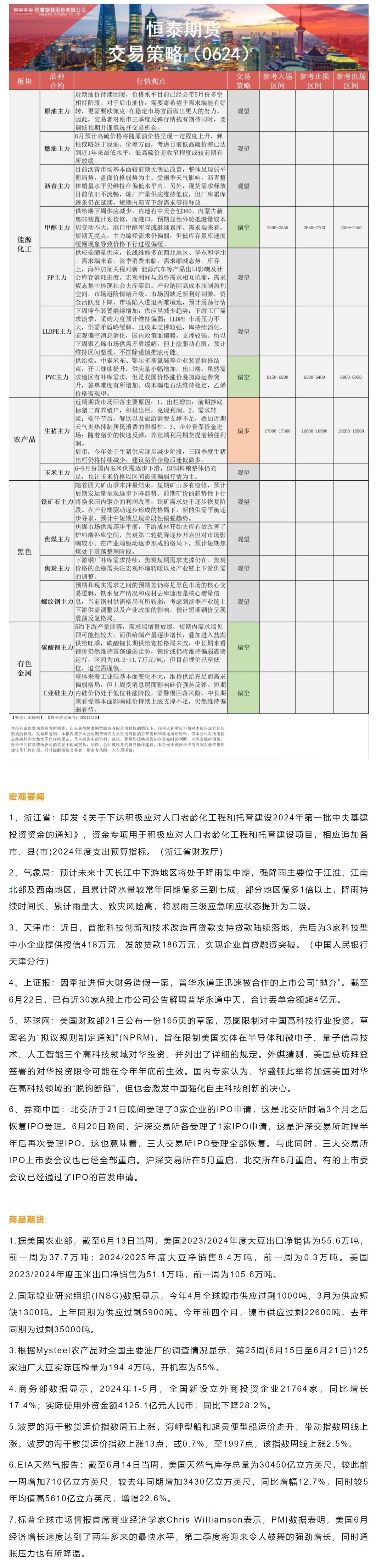 以下是恒泰期货今日早间交易策略,覆盖品种有:宏观分析、原油燃料油等能源化工、玉米生猪等农产品、黑色系如铁矿石焦煤焦炭螺纹钢、有色系如工业硅碳酸锂等。