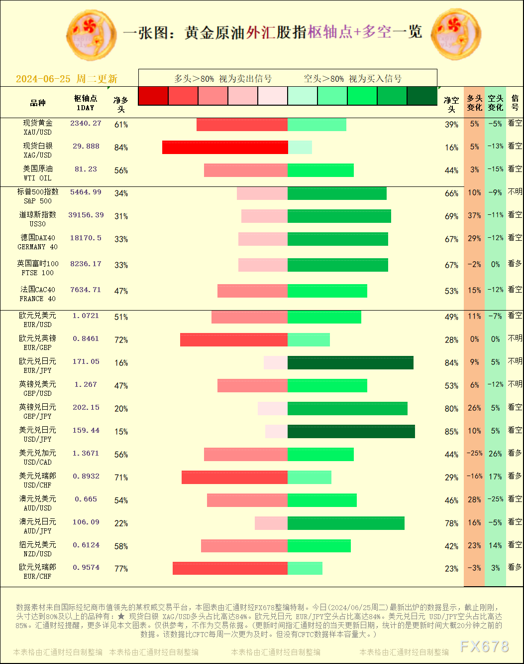 一张图:黄金原油外汇股指"枢纽点+多空占比"一览。今日(2024/06/25周二)最新出炉的数据显示,截止刚刚,头寸达到80%及以上的品种有:★ 现货白银 XAG/USD多头占比高达84%。欧元兑日元 EUR/JPY空头占比高达84%。美元兑日元 USD/JPY空头占比高达85%。汇通财经提醒,更多详见本文图表。仅供参考,不作为交易依据。
