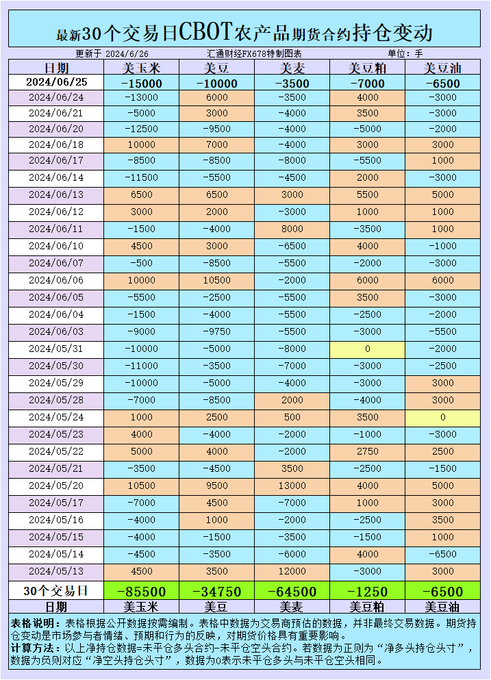 大宗商品基金在周二(6月25日)增加了对CBOT玉米、大豆、小麦、豆粕和豆油的投机性净空头持仓,这一行为反映了基金对市场前景的谨慎态度,同时也可能是对当前市场状况的一种调整。