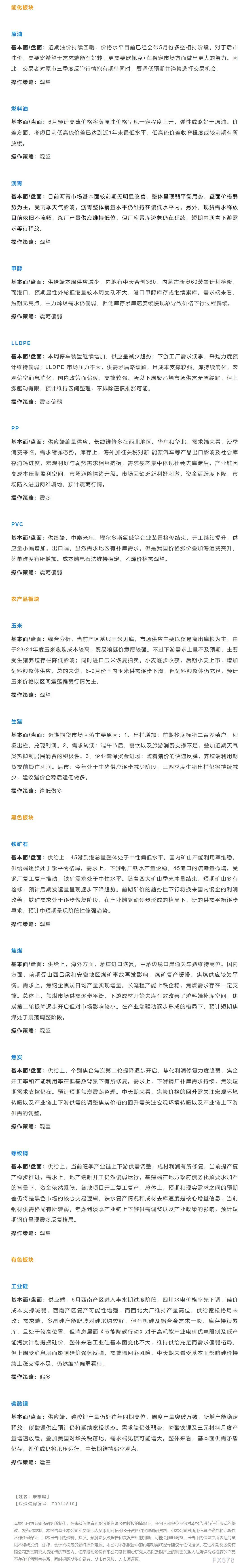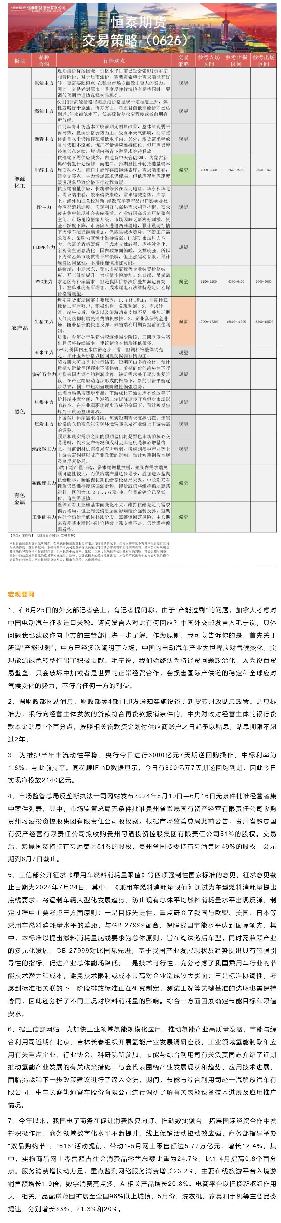 以下是恒泰期货今日早间交易策略,覆盖品种有:宏观分析、原油燃料油等能源化工、玉米生猪等农产品、黑色系如铁矿石焦煤焦炭螺纹钢、有色系如工业硅碳酸锂等。
