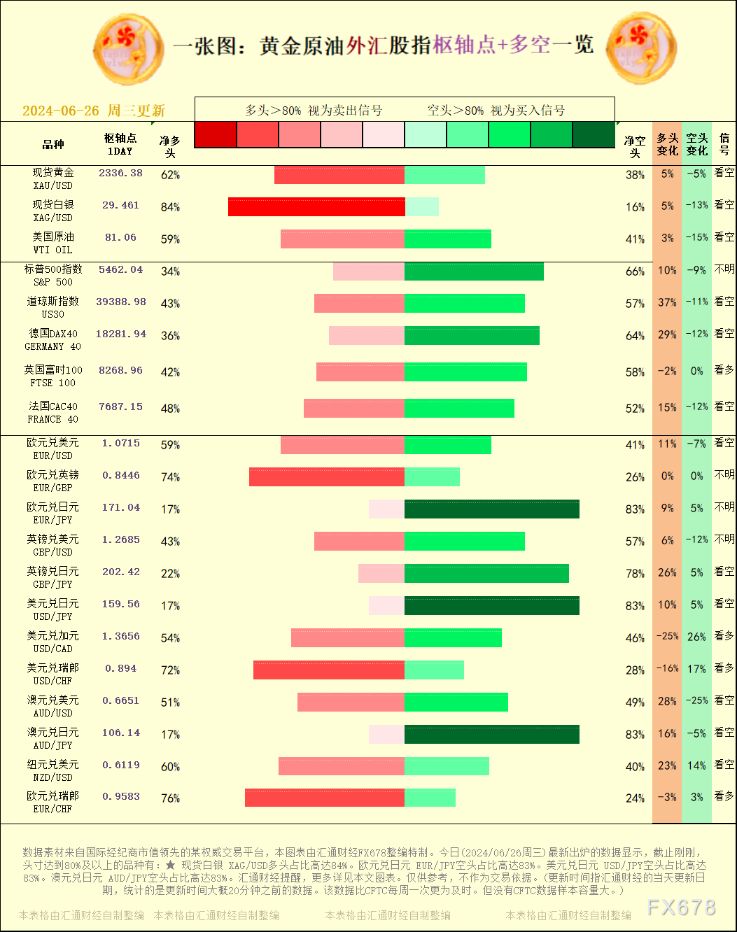 一张图:黄金原油外汇股指"枢纽点+多空占比"一览。今日(2024/06/26周三)最新出炉的数据显示,截止刚刚,头寸达到80%及以上的品种有:★ 现货白银 XAG/USD多头占比高达84%。欧元兑日元 EUR/JPY空头占比高达83%。美元兑日元 USD/JPY空头占比高达83%。澳元兑日元 AUD/JPY空头占比高达83%。汇通财经提醒,更多详见本文图表。仅供参考,不作为交易依据。