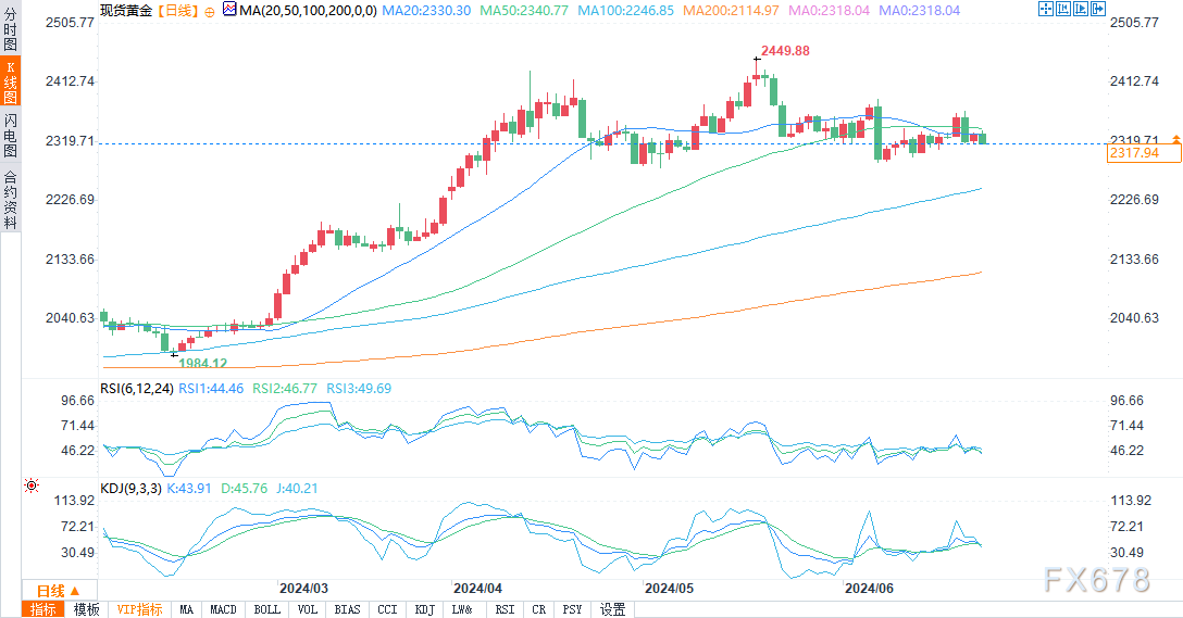 周二(6月25日)纽约时段,金价下跌,盘中报2321.49美元/盎司,跌幅0.54%。美元和美国国债收益率上升推动金价下跌。投资者正在等待本周晚些时候公布的美国通胀数据,该数据可能为美联储今年降息时机提供线索。