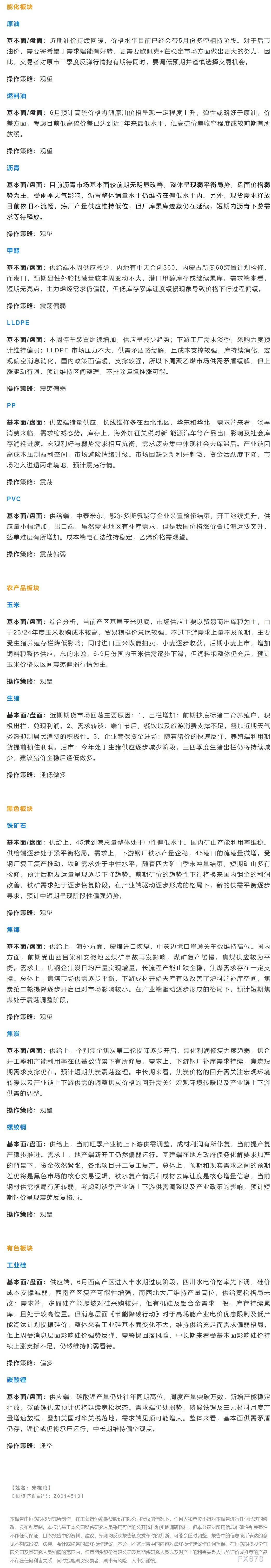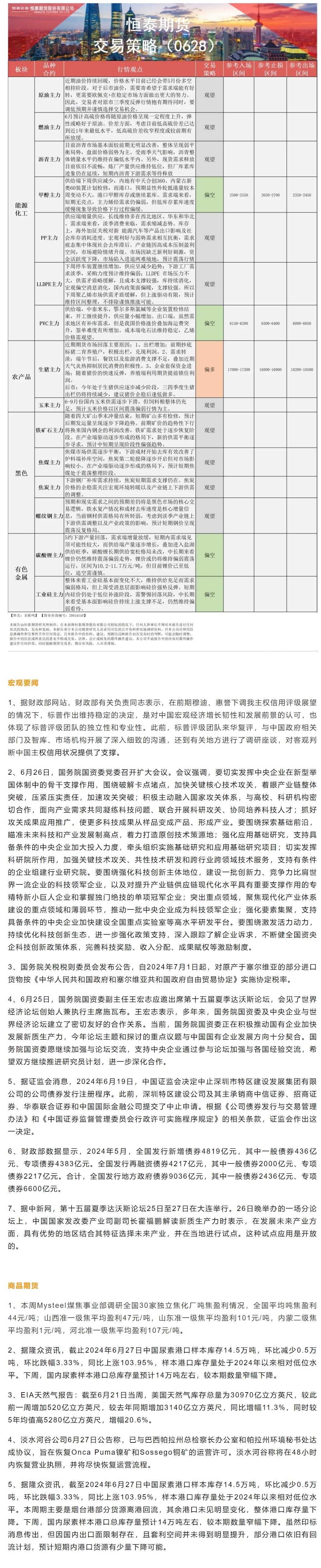 以下是恒泰期货今日早间交易策略,覆盖品种有:宏观分析、原油燃料油等能源化工、玉米生猪等农产品、黑色系如铁矿石焦煤焦炭螺纹钢、有色系如工业硅碳酸锂等。