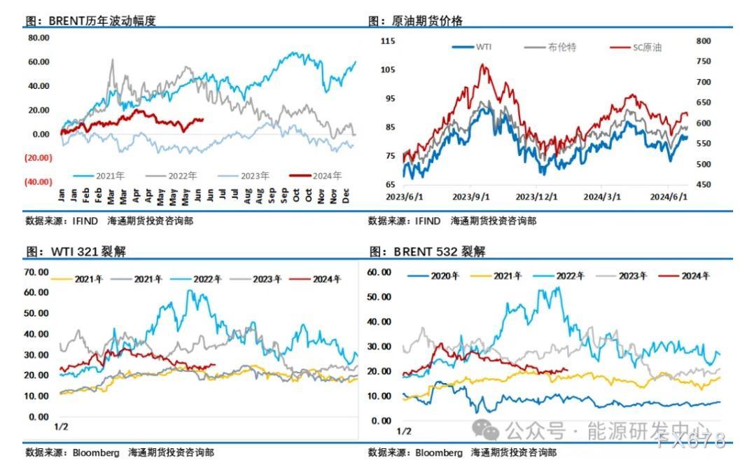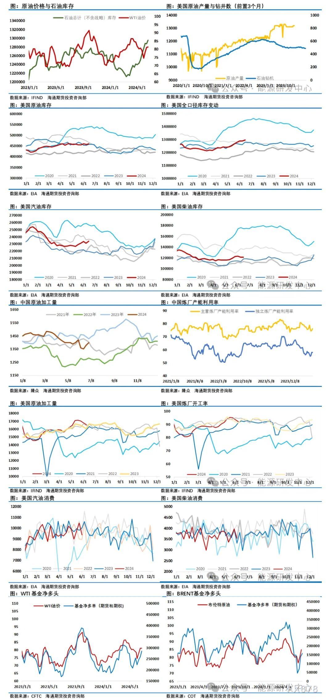 这轮油价上涨背后最初有超跌反弹的修复需求,有供需层面从5月底的糟糕局面中改善,有地缘因素带来的供应担忧,有投机资金平仓空单回补净多头寸的推力,另外这轮油价上行背景是有色金属、黑色金属等工业品持续回落阶段,从走势上可以看出原油跟其他工业品走出了背离的行情,这也推动了资金多原油空其他工业品的配置,资金行为进一步放大了油价的强势。可以看出这轮油价能反弹10美元是多重因素形成合力的结果,虽然从产业视角对油价如此表现有偏离供需的判断,但还是能看出资金对油价看涨的力量还是占据了明显优势,原油月差大幅走强,WTI1-3月差甚至刷新了年内高点,成品油裂解差在这波反弹过程表现较为平稳,供应端继续贡献了主要的推涨力量。原油市场需求端仍没有出现让油价大幅走强的变化,尤其是作为原油最大进口国,在2024年需求增量上被欧佩克寄予了厚望的中国市场,过去一段时间成品油表现跟上游强势原油完全脱节,一方面是国内投资者信心处于低位,另一方面国内成品油消费被替代力度超预期叠加自身需求较弱也是进一步加剧了市场悲观情绪。另外一个市场高度关注的美国市场从今年其汽柴油消费来看也是明显低于去年同期表现。在这种背景下三季度原油市场传统的消费旺季成了市场的希望,目前来看大部分机构对此还是抱有非常高的期待,并判断三季度原油市场将出现明显的供应短缺,能否如期兑现接下来时间将给出答案。