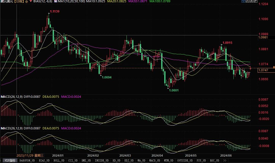 欧元周一(7月1日)开盘跳涨约30点,随后震荡走高,最高触及1.0761,为近两周新高。