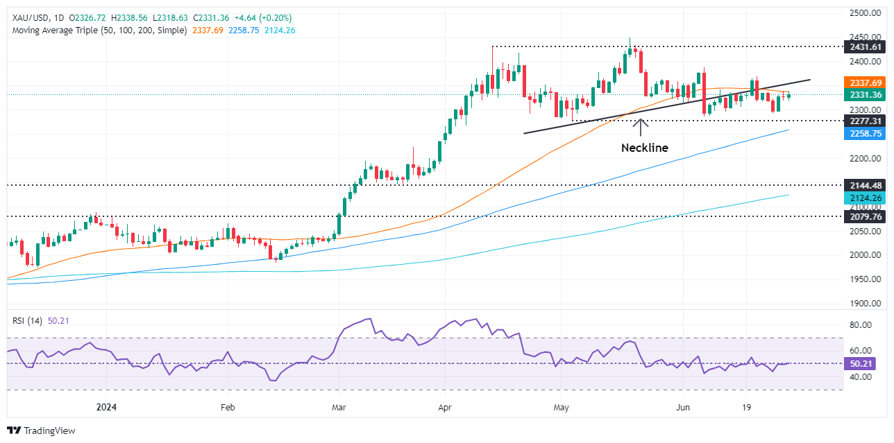 FXStreet分析师Christian Borjon Valencia称,金价仍偏向上行,但仍在2320美元/盎司至2350美元/盎司之间盘整。尽管看跌的头肩形态仍然存在,但动能已转向中性,相对强弱指数(RSI)反弹至50中性线,暗示买家和卖家都尚未控制局势。